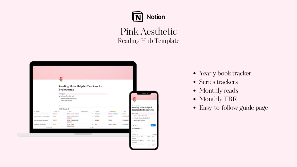 • Yearly reading tracker with page numbers, genres, ratings, book types, and status.
